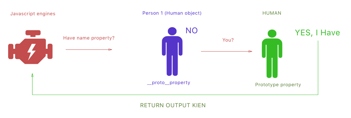 Đối với ví dụ trên, khi person1.name được gọi, javascript engines sẽ kiểm tra property này có tồn tại trên đối tượng person hay không?. Không may thay, trường hợp này thuộc tính name không tồn tại trên đối tượng person, nên nó sẽ tiếp tục tìm kiếm trên dunder proto hoặc trên prototype của đối tượng person. Rất may thuộc tính name tồn tại trên prototype của đối tượng person, nên nó sẽ cho kết quả là Kien