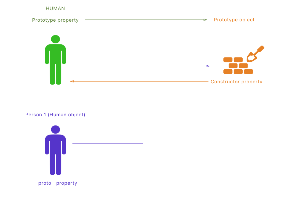 Đầu tiên, khi hàm Human được khởi tạo, javascript sẽ thêm thuộc tính prototype vào hàm. Nói cho dễ hiểu là thằng human sẽ gửi cho constructor 1 cái yêu cầu, nó nói là constructor mày hãy cho tao cái thể hiện đi, constructor hì hục làm việc và trả lại cho nó một cái thể hiện (instance).