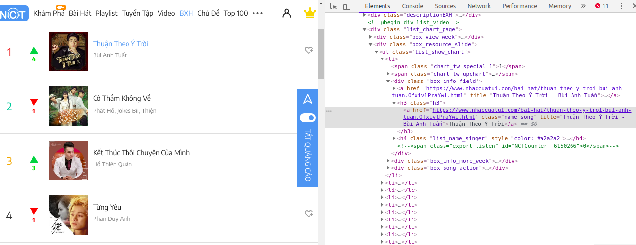 Cùng xem cấu trúc như nào nhé: Chúng ta sẽ có title bài hát và đường link đến bài hát có trong class "name_song". Ok thử xem nào.