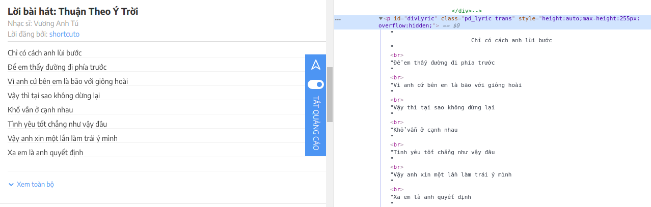 À thì ra họ để trong class "pd_lyric trans" trong thẻ p. Tiếp nào!