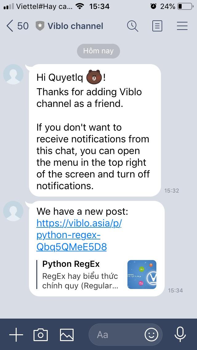 Ngoài nhắn tin/gọi điện, Line cũng có Channel (giống fanpage như Facebook). Khi người dùng follow kênh của bạn, bạn có thể tương tác/push message/notifycation cho người dùng một cách chủ động. Và nó tích hợp vào hệ thống của bạn khá dễ dàng qua API cung cấp từ Line Develop Demo nhẹ