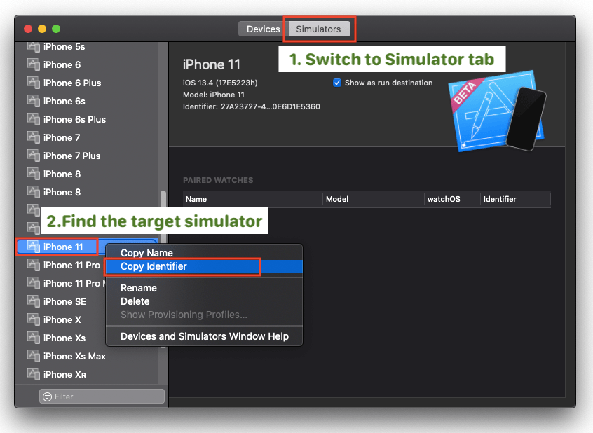 Trước tiên bạn cần identifier của simulator. Trong Xcode bạn nhấn phím tổ hợp phím: Shift + ⌘ + 2 để mở "Devices and Simulators”.
