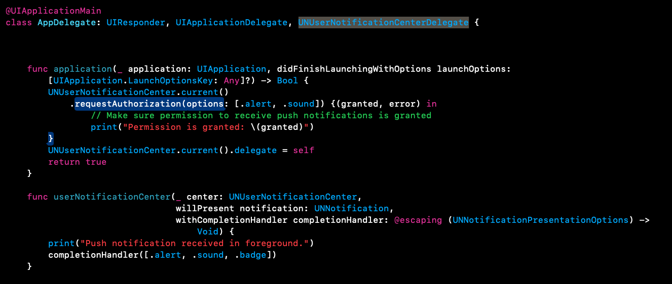 Trong file AppDelegate.swift, bạn import UserNotifications framework. Tiếp theo trong application(_:didFinishLaunchingWithOptions:) bạn thêm đoạn code sau để request permission để nhận được push notificaiton.