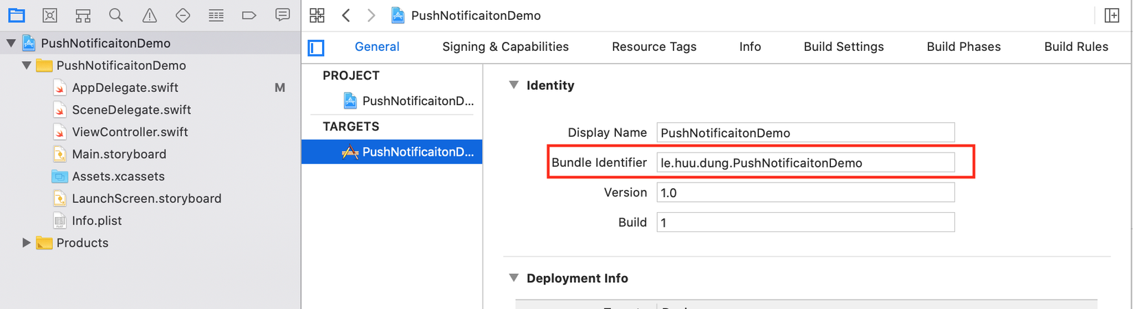 Trước tiên để tạo file payload, chúng ta cần lấy bundle ID từ Xcode để tạo file APNS.