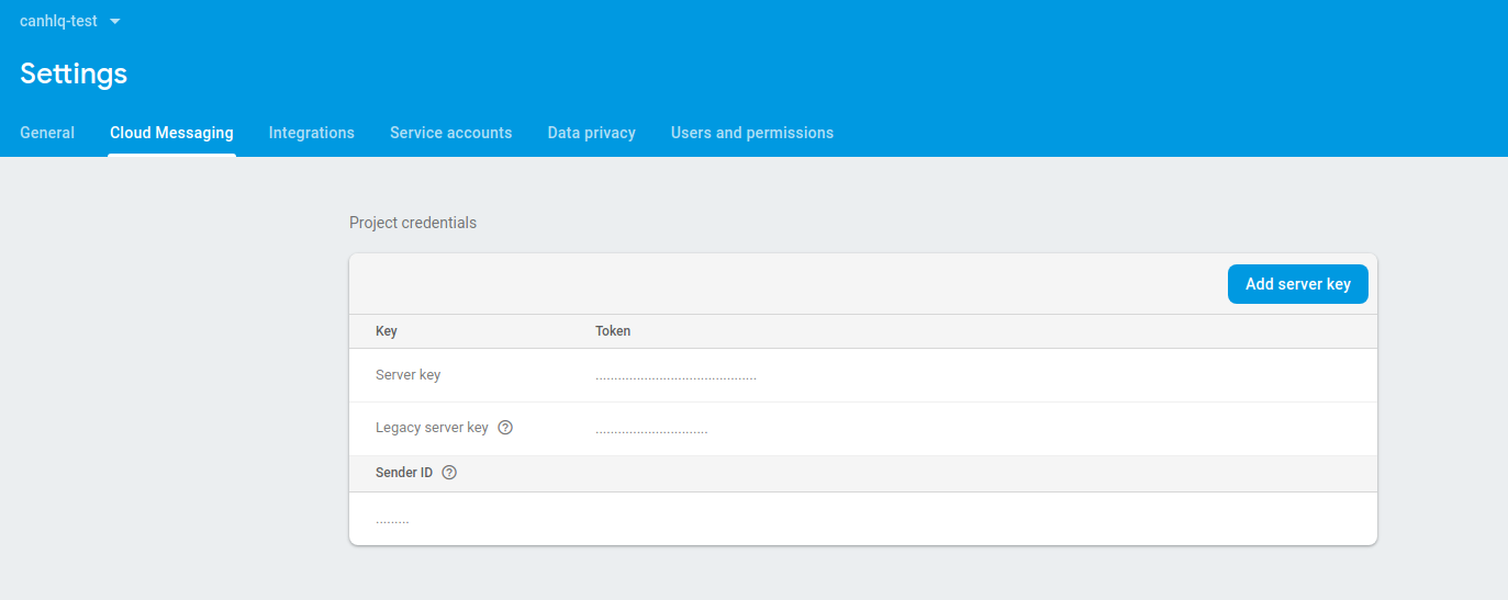 Trong đó FCM_SERVER_KEY là key để server xác thực với FCM. Các bạn có thể truy cập vào Project Console -> Project Settings -> Cloud Messaging. Copy Server key và lưu vào .env