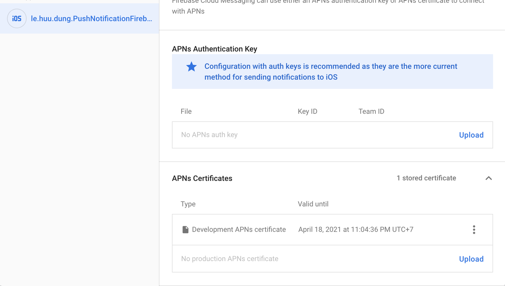 - Trong mục : APNs Certificates bạn update file .P12 lên: