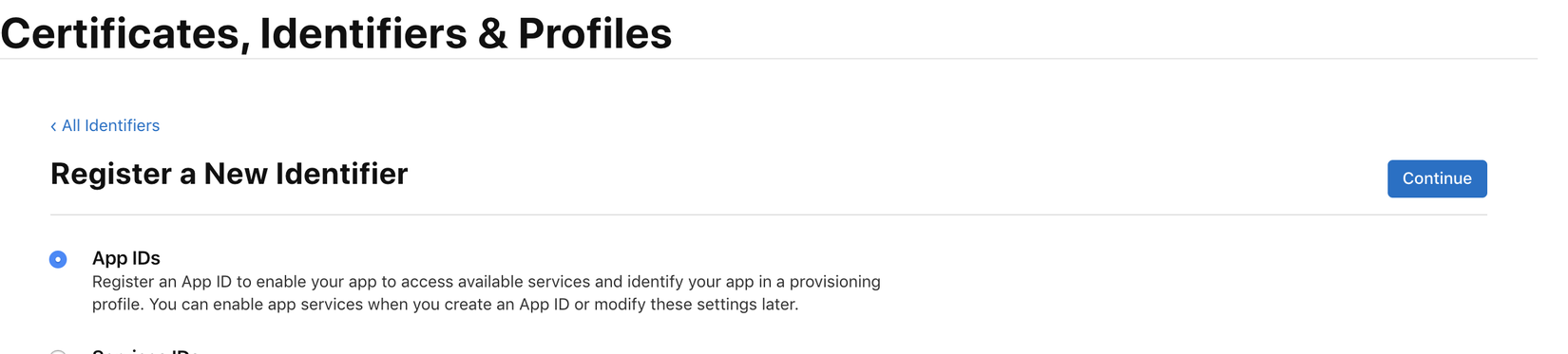 Chọn mục Identifiers và Click (+) để thực hiện đăng ký app ID :
