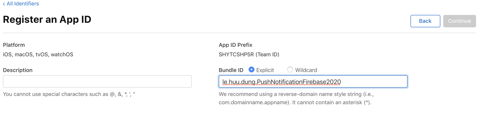 Nhập bundle ID và kéo xuống phần Push Notification để tick chọn và ấn nút Register