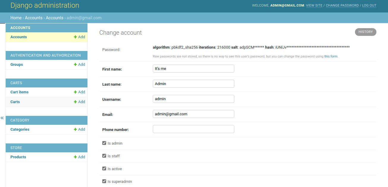 Và thêm đoạn code để superuser quản lý, ở file carts/admin.py: