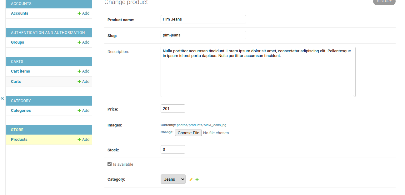 Tiếp theo, chúng ta tạo app store để quản lý bảng product với lệnh startapp store. Trong file store/models.py ta tạo class Product như sau:
