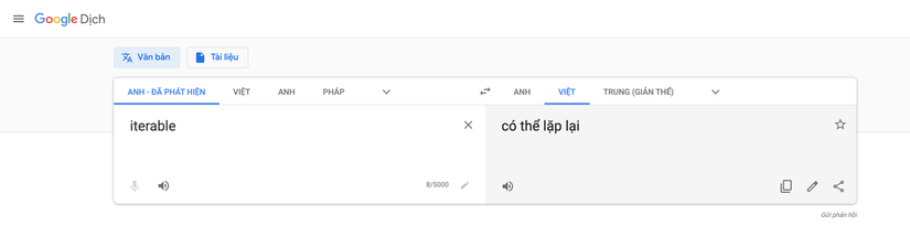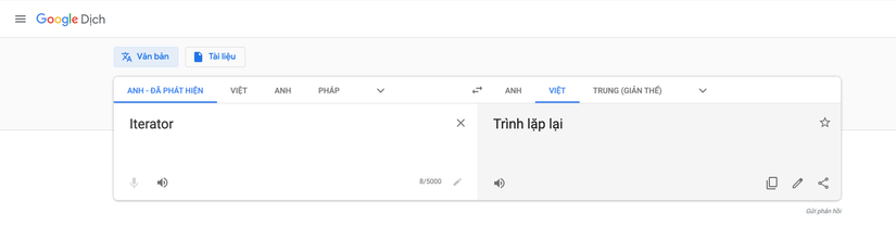Tiếp theo, hãy xem iterator là gì, và mối liên hệ của iterator và iterable. Thực tế khi viết biết này mình đã tìm hiểu ở rất nhiều nguồn tài liệu khác nhau nói giải thích về iterator tuy nhiên mình thấy có điểm chung là các bài viết hơi siêu nhân quá. Để đơn giản thì các bạn cứ thử làm như mình nhé, ném nó lên chị google (nếu các bạn tiếng anh hơi kém :v) sau đó chạy ví dụ, Nói như vậy k phải mình khuyến khích hay khuyên các bạn google dịch đâu nhé, Chẳng qua là mình tìm cách giải thích đơn giản nhất cho mọi người hiểu thôi nha