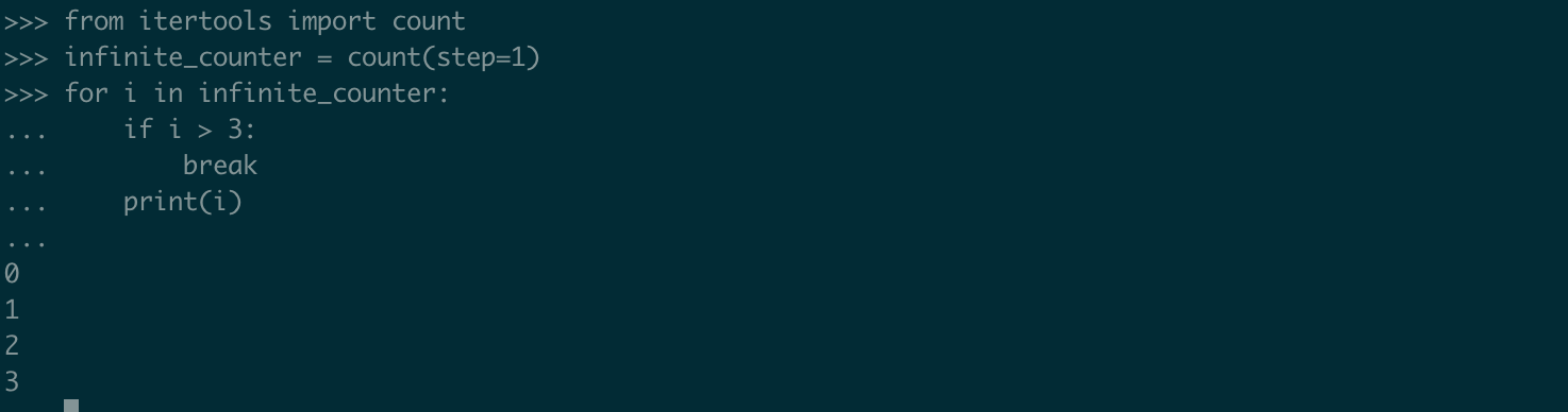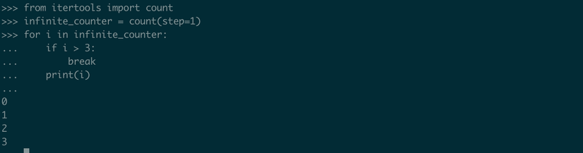 Bạn có thể thấy infinite_counter là 1 iterable object (vì mình có thể dùng for loop để access từng element của nó). Tuy nhiên, nó không có length, và nó sẽ là infinite loop nếu mình gỡ bỏ dòng lệnh break. Ở ví dụ này mình có tham khảo ở đây các bạn có thể ghé xem qua nhé https://medium.com/swe-tieng-viet/iterator-vs-generator-trong-python-703ad12c73a7.