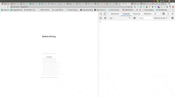 Các xử lý về thao tác vẽ canvas chúng ta sẽ không bàn đến tại đây. Chúng ta sẽ tập trung vào hàm updatePredictions(). Hàm này sẽ thực hiện lấy dữ liệu từ canvas mỗi khi có thao tác vẽ một đường mới trên canvas. Hàm này thực hiện lấy hình ảnh từ canvas hiện tại và đưa vào mô hình để dự đoán. Sau đó cập nhật kết quả vào phần view. Chúng ta thử chạy mô hình xem sao