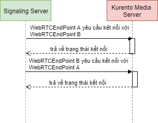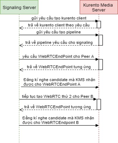 Ở bước này đầu tiên ta cần phải tạo một kurentoClient bằng cách gọi hàm kurento ( được kurento cung cấp ) nhằm kết nối tới KMS.Sau khi đã kết nối được với KMS,chúng ta cần gửi yêu cầu đến tạo một pipeline, chúng ta sử dụng đối tượng kurentoClient đã tạo trước đó gọi hàm create (được thiết kế để tương tác với KMS như đề cập ở chương trước) với tham số là MediaPipeline.Tiếp đó, ngay sau khi có được pipeline, chúng ta cần hai WebRTCEndpoint cho hai trình duyệt tương ứng A và B. Mục đích của việc này là để các luồng media hoạt động trên KMS có thể trao đổi với nhau.