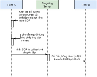 Khi thực hiện việc đăng kí thành công,để bắt đầu thiết lập cuộc gọi, mỗi bên cần biết một thông số nhất định.Đầu tiên, bắt đầu khởi tạo một đối tượng là WebRtcPeer ( đã nhắc qua ở chương 2).Sau đó ta bắt đầu thiết lập một callback để lắng nghe SDP offer được gửi về. Khi nhận được SDP thành công, Peer A bắt đầu gửi yêu cầu cấp quyền truy cập một số tài nguyên thiết bị tới người dùng.Nếu người dùng đồng ý, chúng ta bắt đầu thực hiện quá trình tiếp theo là gửi các thông tin ban đầu từ Peer A ( như là SDP, đến từ đâu, muốn kết nối tới đâu…) đến signaling.Signaling có nhiệm vụ lưu lại các thông tin này và bắt đầu thông báo tới trình duyệt B là có ai đó muốn kết nối.Khi Peer B nhận được thông báo bên A muốn kết nối, nó sẽ thiết lập tương tự như Peer A khi lấy SDP offer và truy cập thiết bị. Khi đó Signaling sẽ có thông tin của hai Peer và bắt đầu vào quá trình thiết lập cuộc gọi với KMS.