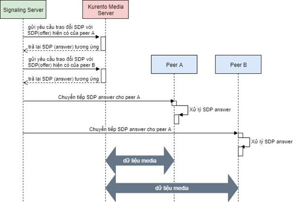 Bước cuối cùng trong việc thực hiện thiết lập cuọc gọi là việc trao đổi SDP với KMS.Bên phía signaling đã có hai SDP offer được gửi cho nó từ lần trước.Cái signaling làm là gọi sử dụng đối tượng WebRTCEndPoint mà KMS đã trả về từ trước, gọi hàm processOffer với tham số là SDP offer tương ứng với mỗi peer và một callback.Khi thực hiện điều này, bên phía KMS sẽ đáp lại SDP answer và gửi trả về tương ứng với mỗi peer.Sau khi nhận được SDP answer, mỗi peer sẽ gọi processAnswer để xử lý SDP answer được trả về. Từ đây mỗi peer có thể tương tác với nhau, gửi/nhận dữ liệu media qua KMS.