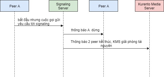 Pha cuối cùng trong quy trình là ngừng cuộc gọi. Khi có yêu cầu ngừng từ một peer, peer này sẽ kết thúc phiên tương tác bằng cách ngắt kết nối camera và gửi yêu cầu tới signaling, signaling sẽ tiếp tục gửi lại yêu cầu này tới peer đang tương tác và thực hiện tương tự. Tiếp theo signaling sẽ gửi tới KMS yêu cầu ngắt kết nối với hai peer và giải phóng tài nguyên, kết thúc phiên làm việc. Hình dưới mô tả phiên làm việc kết thúc tương tác.