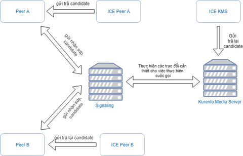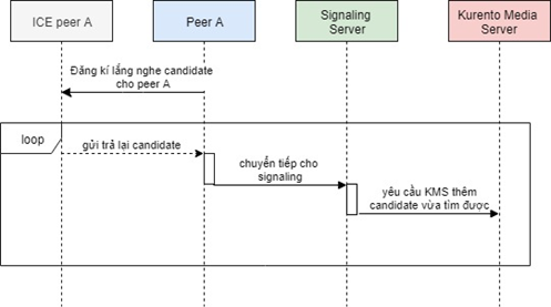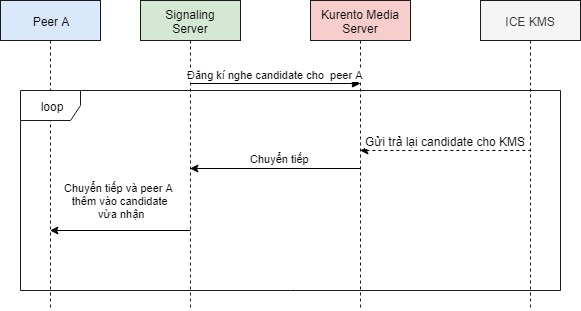 Quá trình này song song với quá trình đạt được SDP, mục đích của quá trình này nhằm mở ra các cách khác nhau mà cách peer khác có thể kết nối với A.Đầu tiên ta cần làm là đăng kí lắng nghe candidate tới ICE peer A bằng cách ta sẽ thiết lập một callback là OnIceCandidate ( đây là một option khi tạo đối tượng WebRtcPeer).Khi đó,ICE cho trình duyệt A sẽ thực hiện chức năng của nó là tìm các cách để có thể kết nối với A. Khi tìm được, nó sẽ gửi lại cho trình duyệt A thông qua hàm callback OnIceCandidate.Bước tiếp theo trình duyệt A gửi lại cho signaling server, server này đơn giản là ủy quyền lại cho Kurento Media Sever (KMS) bằng cách gọi addCandidate để yêu cầu thêm vào các cách để kết nối với A (candidate).Vì vậy KMS sẽ biết cách để kết nối với peer A.Việc này tương tự với Peer B.