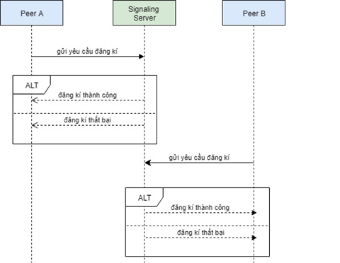 Bước này thực hiện khá đơn giản với việc có 3 tác nhân là người dùng A, người dùng B và signaling server.Server này sẽ là trung gian xử lý các yêu cầu đăng kí của hai bên (ví dụ có thể lưu vào database).Nó cũng đưa ra các quyết định liệu có thể cho người dùng đăng kí hay không.Có hai trạng thái mà nó gửi về cho người dùng ở bước này là đăng kí thành công và đăng kí thất bại. Hình dưới mô tả pha đăng kí người dùng.