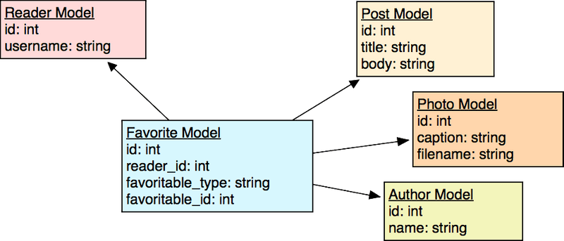 Mô hình là model Favorite đại diện cho sự liên kết giữa người reader và các mục riêng lẻ - các bản ghi cùng loại của nó vừa thuộc về một người đọc vừa thuộc về một mục favoritable - và đó là lúc polymorphic: true phát huy tác dụng.