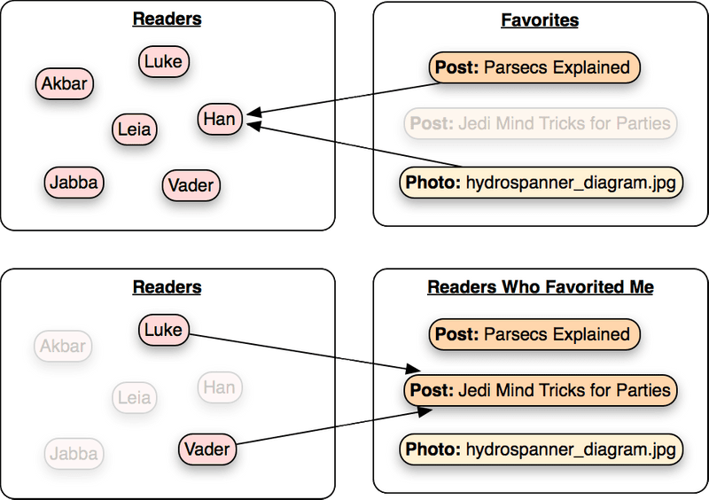 Vì vậy, một reader có thể yêu thích nhiều posts, images và authors, nhưng cũng có thể một bài post, image hoặc author duy nhất có thể được nhiều độc giả yêu thích.