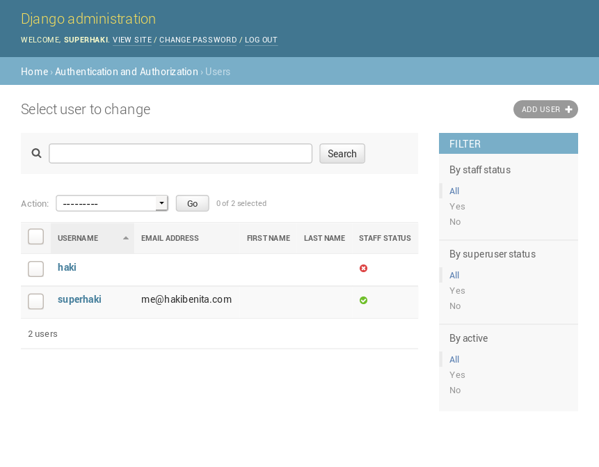 Tại thời điểm này, nếu bạn đăng nhập vào trang Admin của mình tại http://127.0.0.1:8000/admin/auth/user, bạn sẽ thấy trang admin dành cho user vẫn không thay đổi: