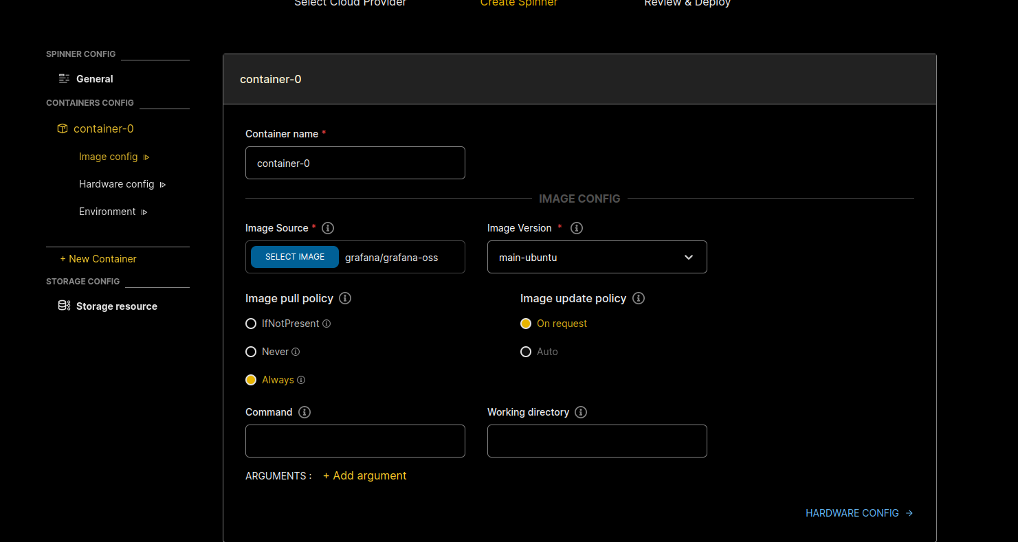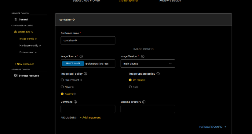 Mình chọn image là grafana/grafana-oss, tag là main-ubuntu