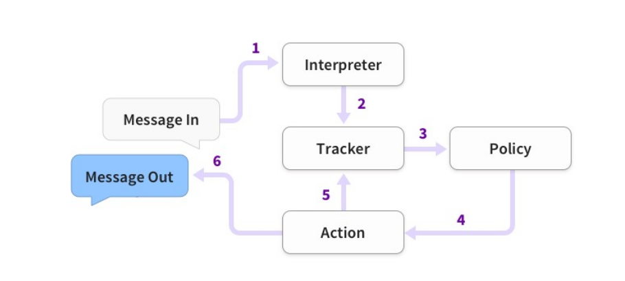 - Tin nhắn được nhận và chuyển đến một Interpreter, trong đó chuyển đổi nó thành một từ điển bao gồm văn bản gốc, ý định và bất kỳ thực thể nào được tìm thấy.