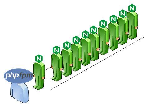 Mỗi người màu xanh là các request từ NGINX. Ở trên chỉ có một supermarket (PHP-FPM worker), để giao dịch với mỗi request. Thông thường, với FAST PHP script, hàng đợi sẽ được xử lý trước khi bạn có thể nhận thấy.