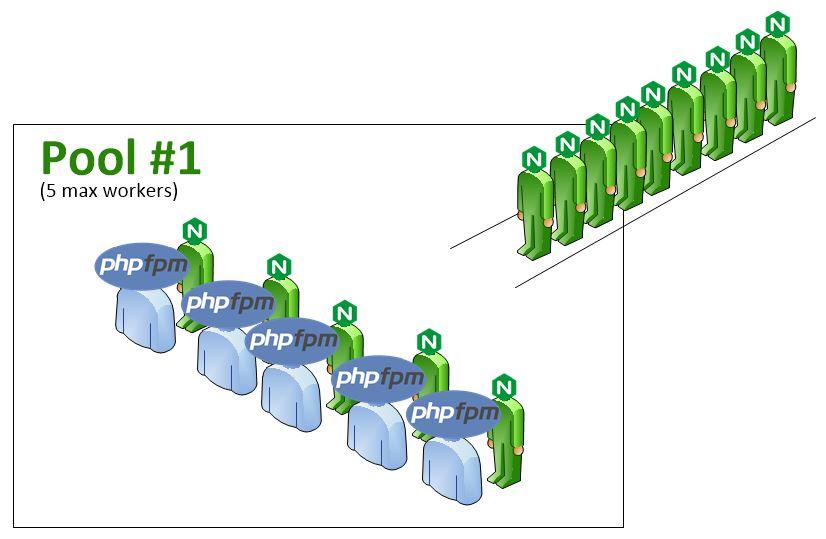 Lưu ý: Từ những cái tôi đã đọc, một hàng đợi request là không cô lập trên một PHP-FPM worker, mà là PHP-FPM master process. FPM là viết tắt cho FastCGI Process Manager, từ khóa ở đây là Manager, thứ mà sẽ quản lý công việc tải đến workers trong pools. Ví dụ, bạn có 1 pool, với 5 workers, mỗi worker không có hàng đợi của riêng nó, master process sẽ quản lý mỗi request dựa trên tất cả các pools và workers dưới điều khiển của nó.