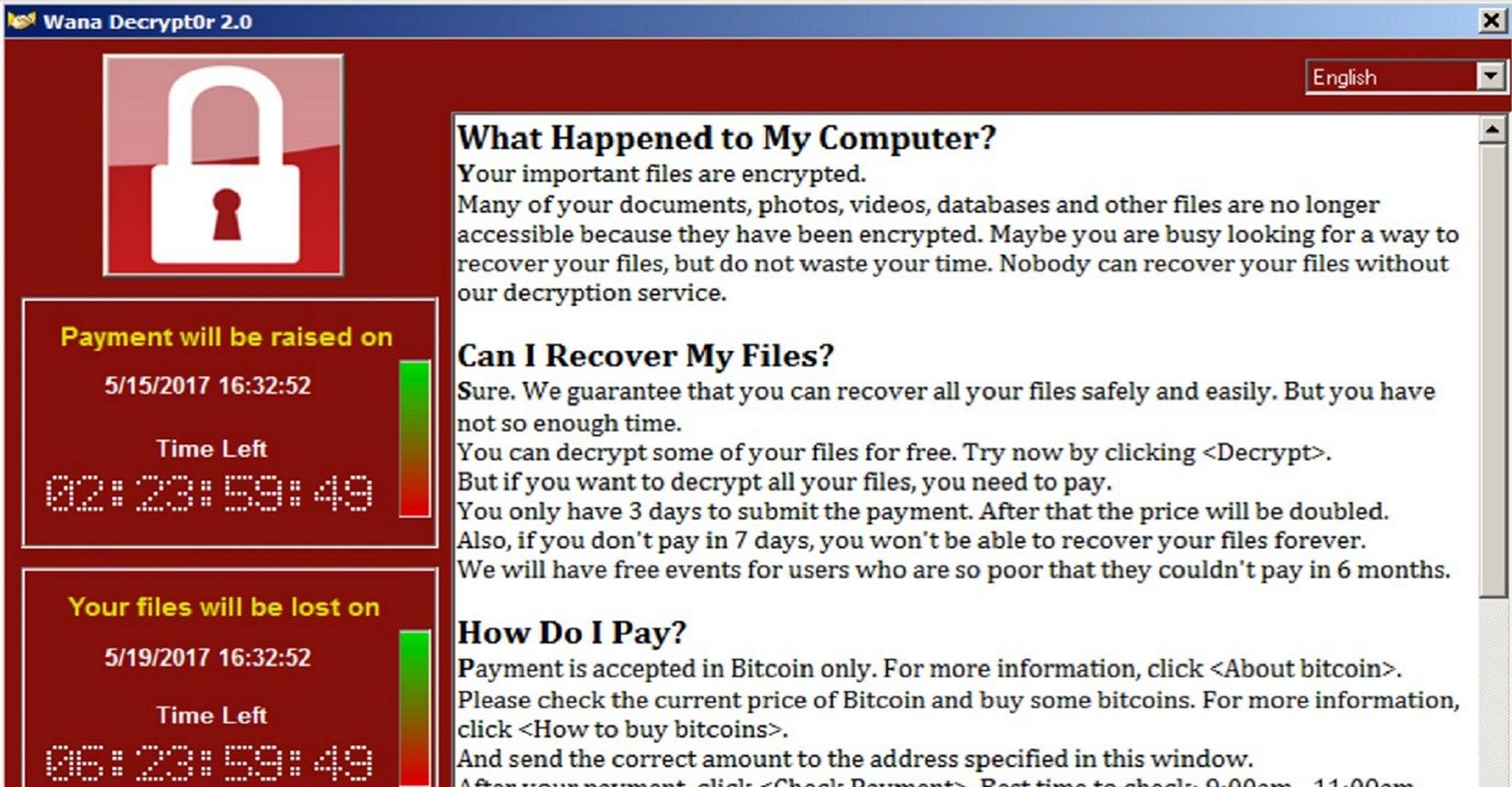 Mình sẽ lấy vụ tấn công của WannaCry năm 2017 làm một ví dụ cho phần này nhé. Đây là một vụ tấn công khá nổi năm 2017 trên phạm vi toàn thế giới, thực hiện bởi một worm mã hóa nhằm mục đích tống tiền tên là WannaCry. Mã độc này nhắm chủ yếu tới các máy tính sử dụng hệ điều hành Windows, thực hiện mã hóa các file trên máy và đòi tiền chuộc qua tiền mã hóa Bitcoin.