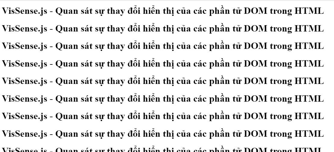 VisSense.js là một thư viện được sử dụng để quan sát sự thay đổi hiển thị của các phần tử DOM. Nó giúp nhận biết khi nào một phần tử bị ẩn, hiển thị một phần hoặc hiển thị đầy đủ trên màn hình. VisSense.js rất nhẹ (< 4KB), và Không phụ thuộc vào các thư viện khác.