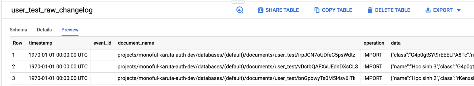Vì chúng ta dựa vào việc trigger sự thay đổi của firestore để tạo bảng log nên đối với những data trước khi tạo bigquery và k có sự thay đổi thì sẽ k có mặt trong log => gcp có hỗ trợ import data collection vào bảng log nhé