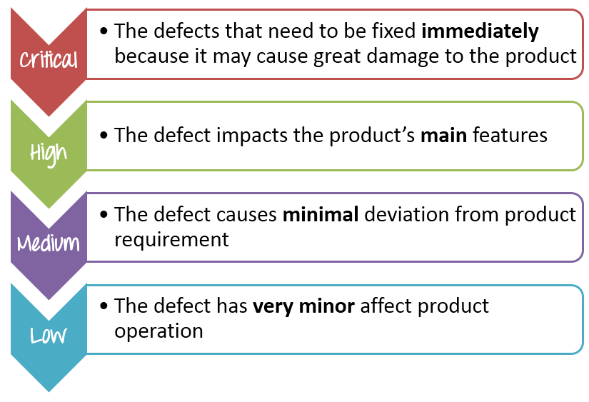 - Priority - Mức độ ưu tiên, mức độ nghiêm trọng có thể cao / trung bình / thấp dựa trên mức độ khẩn cấp tác động mà tại đó lỗi phải được khắc phục tương ứng.