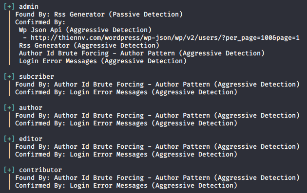 - WpScan sử dụng các mode để enumerate thông tin users, plugin, themes là: passive (thụ động - scan với lượng request ít và tránh gây DOS server), aggressive (Chủ động - Scan với số lượng request lớn và liên tục tới server), mixed (Kết hợp cả 2). Mặc định WPScan sẽ scan với mode :mixed
