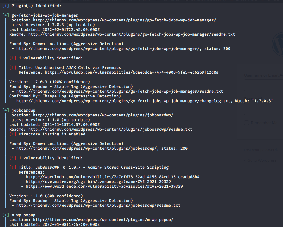 wpscan --url http://thiennv.com/wordpress/ -e vp --plugins-detection aggressive --api-token QZhn2Ior.....gzbOYbREHYk
