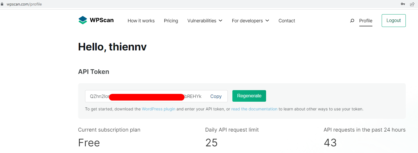 Scan với api-token Việc sử dụng api để scan giúp chúng ta phát hiện được thêm nhiều thông tin và lỗ hổng của các plugin, theme được public trên website https://wpscan.com