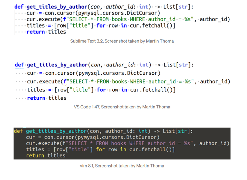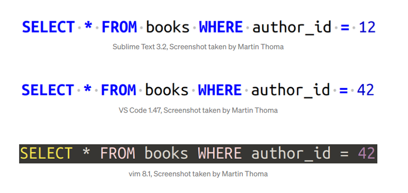Điều này vẫn là 1 vấn đề mở với nhiều ngôn ngữ/editor: Khi developer viết câu SQL của họ trong 1 string, làm thế nào editor biết strings cần được phân tích. Làm thế nào editor biết họ muộn highlight syntax, ... Bạn có thể vừa thấy ví dụ ở trên syntax-highlight bị thiếu, nhưng đây là ảnh chụp màn hình của vài editor phổ biến :