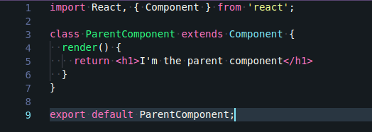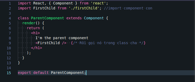 OK, bây giờ trong file parentComponent, đầu tiên chúng ta import React và Component (vậy thì React hiểu class này là 1 component), rồi định nghĩa 1 class như dưới: