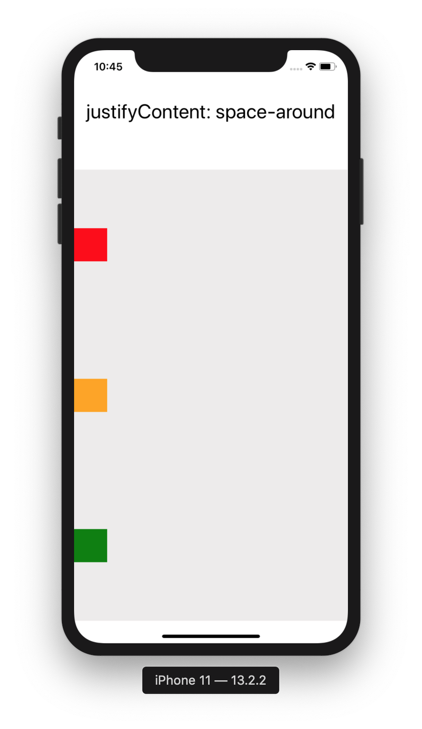 - space-around: sắp xếp sao cho các view con có khoảng cách bằng nhau, và có khoảng cách giữa cạnh view ngoài cùng với view cha bằng một nửa so với khoảng cách giữa 2 view con.