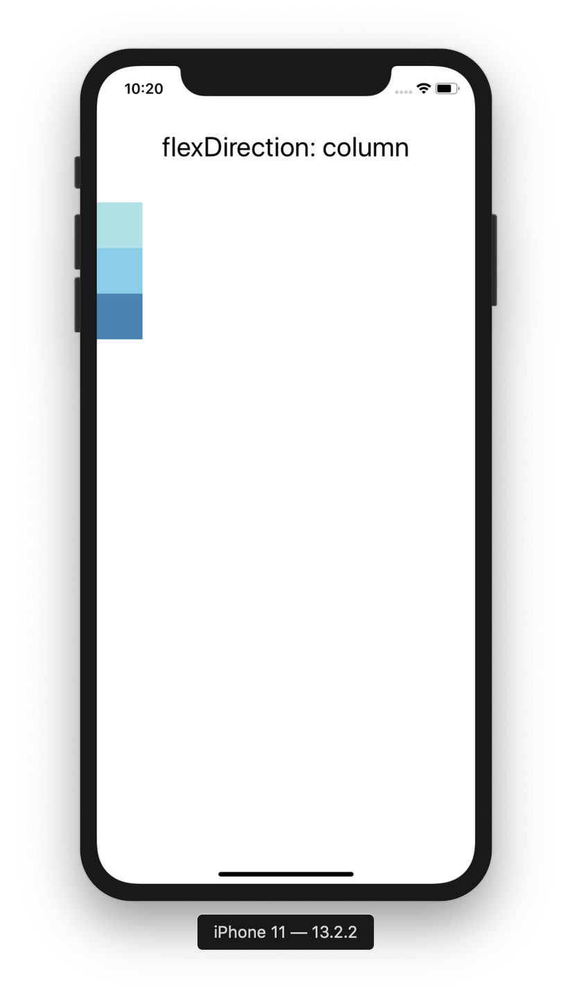 - column (là giá trị mặc định): các view con được căn chỉnh theo chiều dọc, từ trên xuống dưới. Bạn quay về ví dụ về thuộc tính flex, mình không set giá trị cho thuộc tính flexDirection nên nó nhận giá trị mặc định là column, hiển thị từ trên xuống dưới.