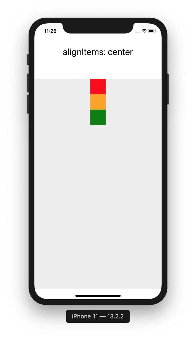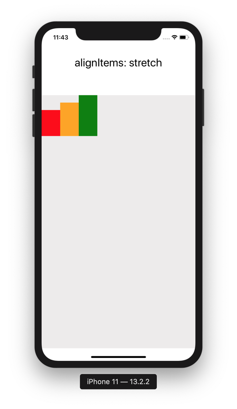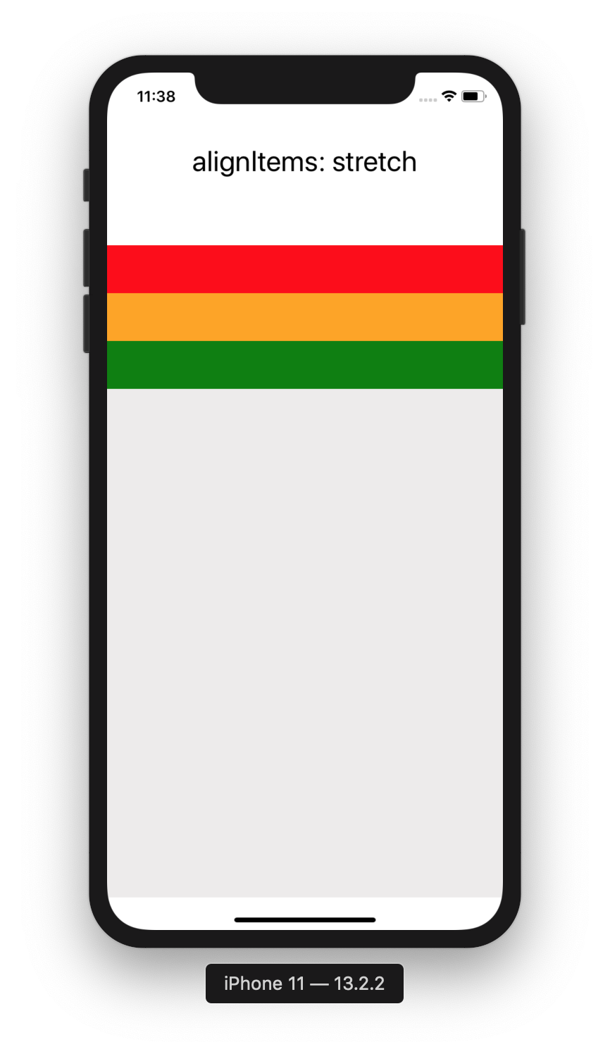 - stretch (giá trị mặc định): các view con sẽ dãn ra bằng kích thước của cross axis, bạn phải đặt chiều rộng là auto (khi flexDirection là column, hoặc chiều cao là auto khi flexDirection là row), nếu không, giá trị height sẽ ghi đè stretch.