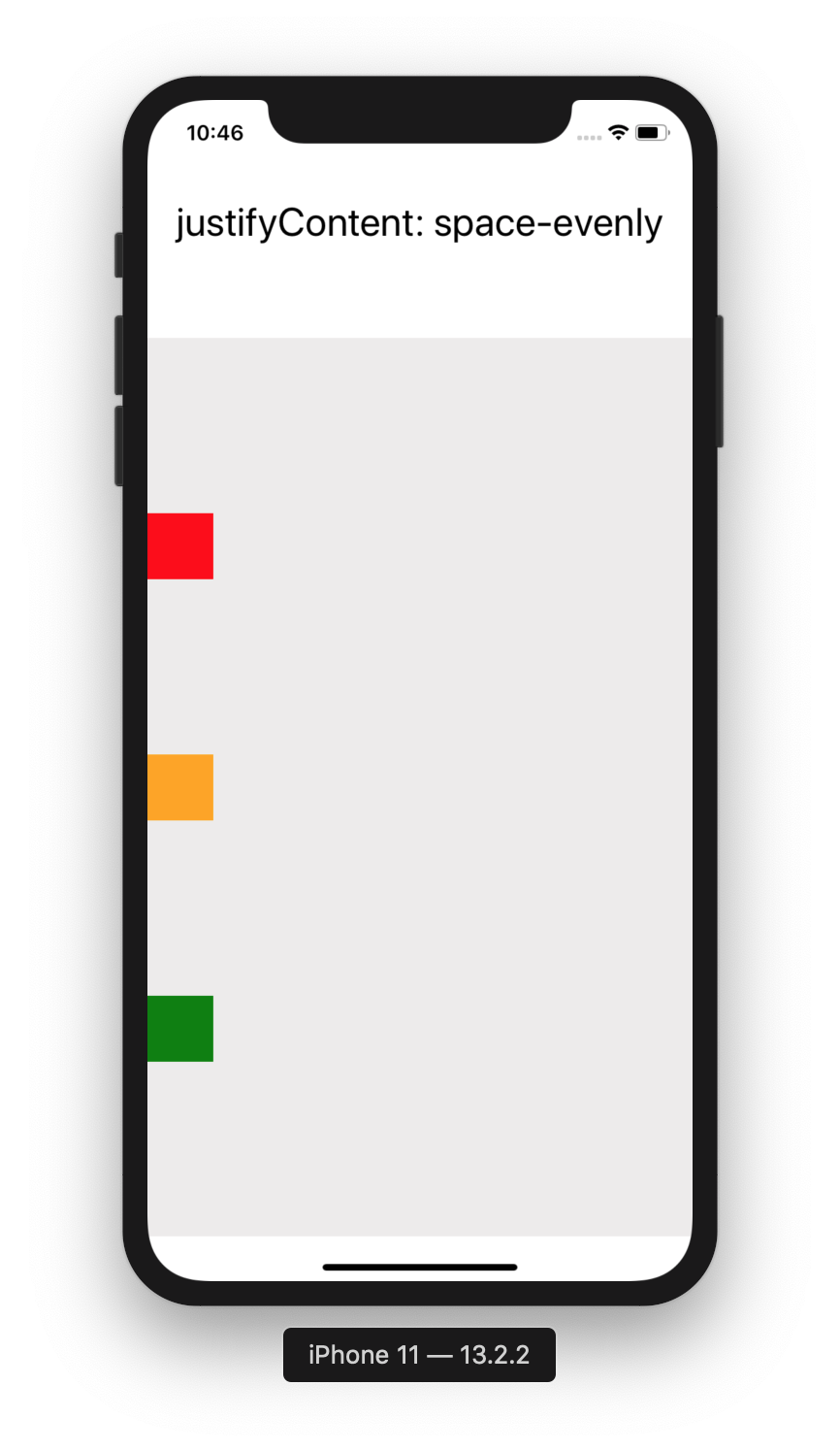 - space-evenly: sắp xếp sao cho các view con có khoảng cách bằng nhau, và có khoảng cách giữa cạnh view ngoài cùng với view cha bằng với khoảng cách giữa 2 view con.