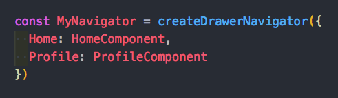 Bây giờ, hãy tạo drawer navigation trong file App.js. Tôi sẽ đặt tên cho drawer navigation của mình là "MyNavigator". Navigator này sẽ có 2 màn hình là : ‘HomeComponent’ screen và ‘ProfileComponent’ screen . Các màn hình chỉ định cho từng item trong navigator là tên của các component tôi muốn hiển thị khi người dùng nhấn vào item đó.