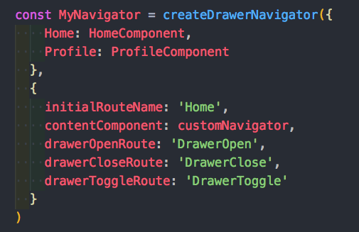 Tiếp theo, chúng ta phải thêm một vài configurations cho drawer navigator của chúng ta. Đầu tiên là initialRouteName, đây là màn hình default bạn muốn hiển thị. Thứ hai là contentComponent nơi chúng ta sẽ gán customNavigator và ba cái cuối cùng là drawerOpenRoute, drawerCloseRoute, và drawerToggleRoute, cả ba đều bắt buộc khi bạn tùy chỉnh drawer navigator của mình.