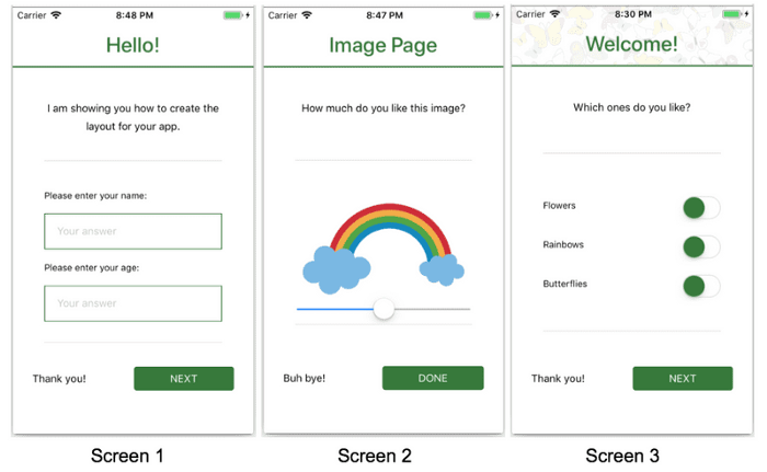 VD: Ứng dụng của mình sẽ có 3 màn hình đơn giản như sau: