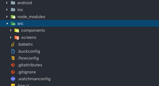Khi bạn đã tạo thư mục src, bạn phải tạo thêm hai thư mục bên trong thư mục src. Một cho các màn hình mà bạn sẽ tạo và một cho các thành phần (components). Cấu trúc code của bạn sẽ trông giống như sau: