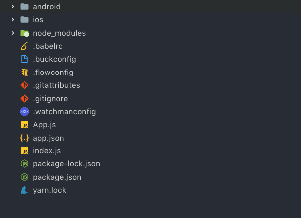 Bạn có thể thấy cấu trúc code đầy đủ của ứng dụng được cài đặt với các file và thư mục mặc định được cung cấp bởi React-native-cli.