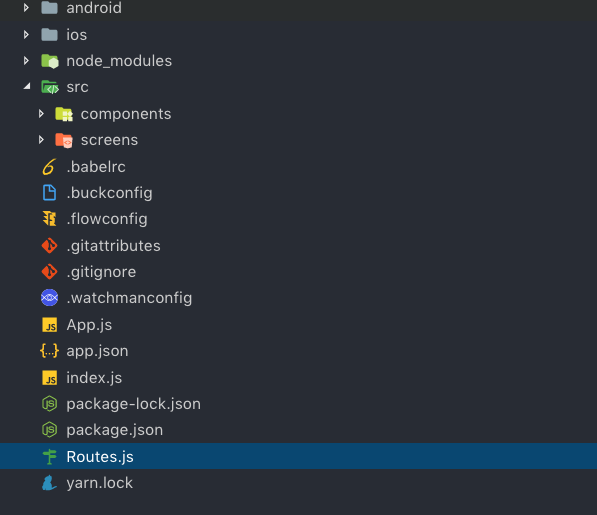 Sau khi React Navigation được cài đặt, hãy chuyển đến cấu trúc thư mục và tạo một tệp có tên là Route.js. Nơi này sẽ chứa mã code để điều hướng giữa các màn hình trong ứng dụng. Nó nên được thêm vào bên ngoài thư mục src: